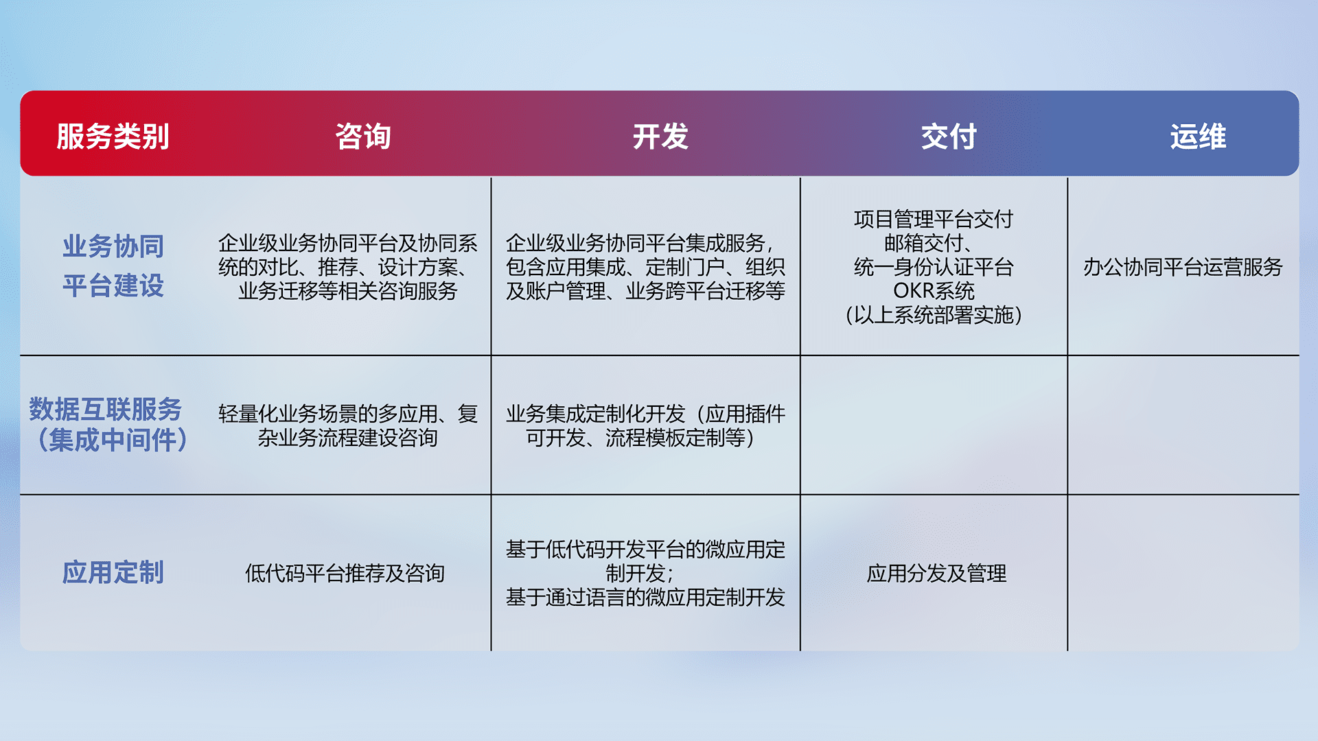 针对钉钉、、、企微、、、IDaas等平台级产品提供产品的规划、、、、方案、、交付、、、、定制化开发等服务,,,,实现如统一协同办公、、智能客户服务、、、、混合会议管理、、、、智能数据查询、、、、等业务场景,,,实现数字化转型。。。